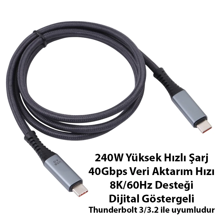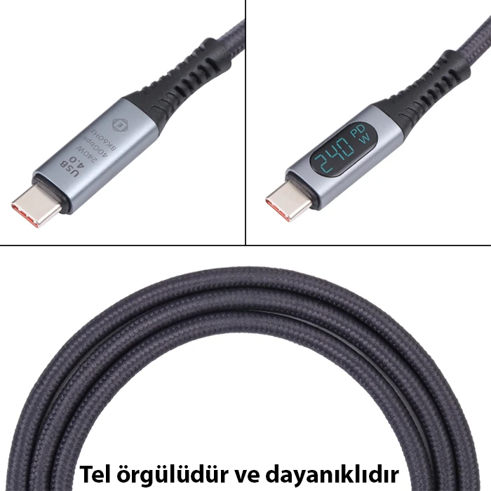 ALLY Ally USB 4.0 240W Type-C to Type-C Dijital Göstergeli 8K Görüntü-Data ve Hızlı Şarj Kablosu 1m