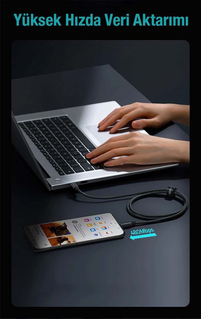 Kablo yalnızca şarj değil 480 Mbps hızında veri iletimi sağlar.