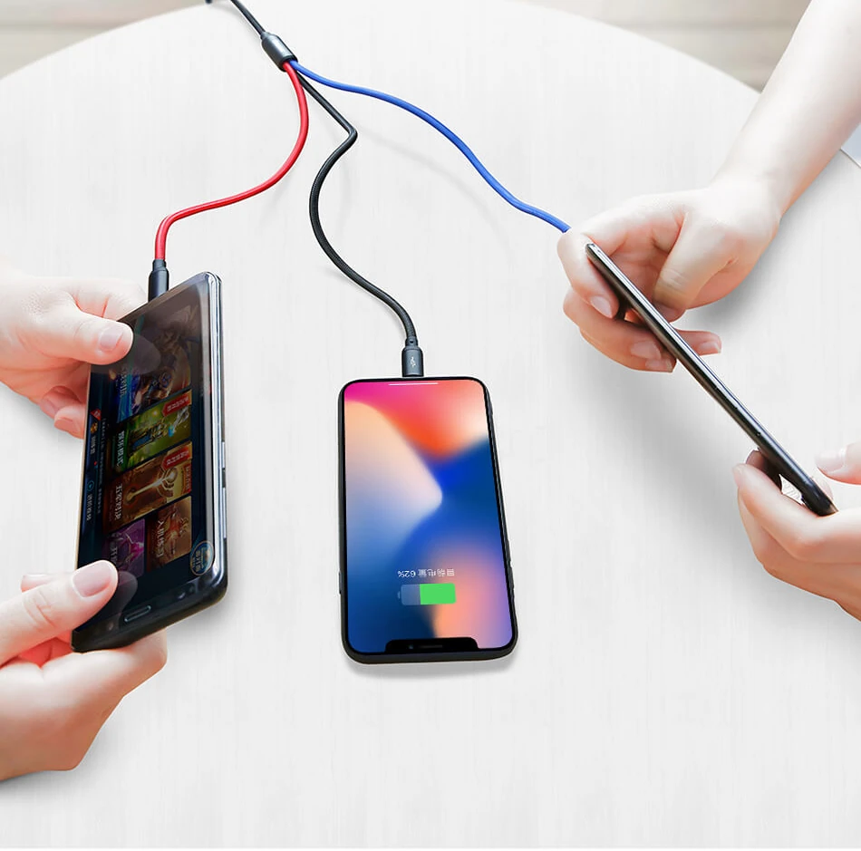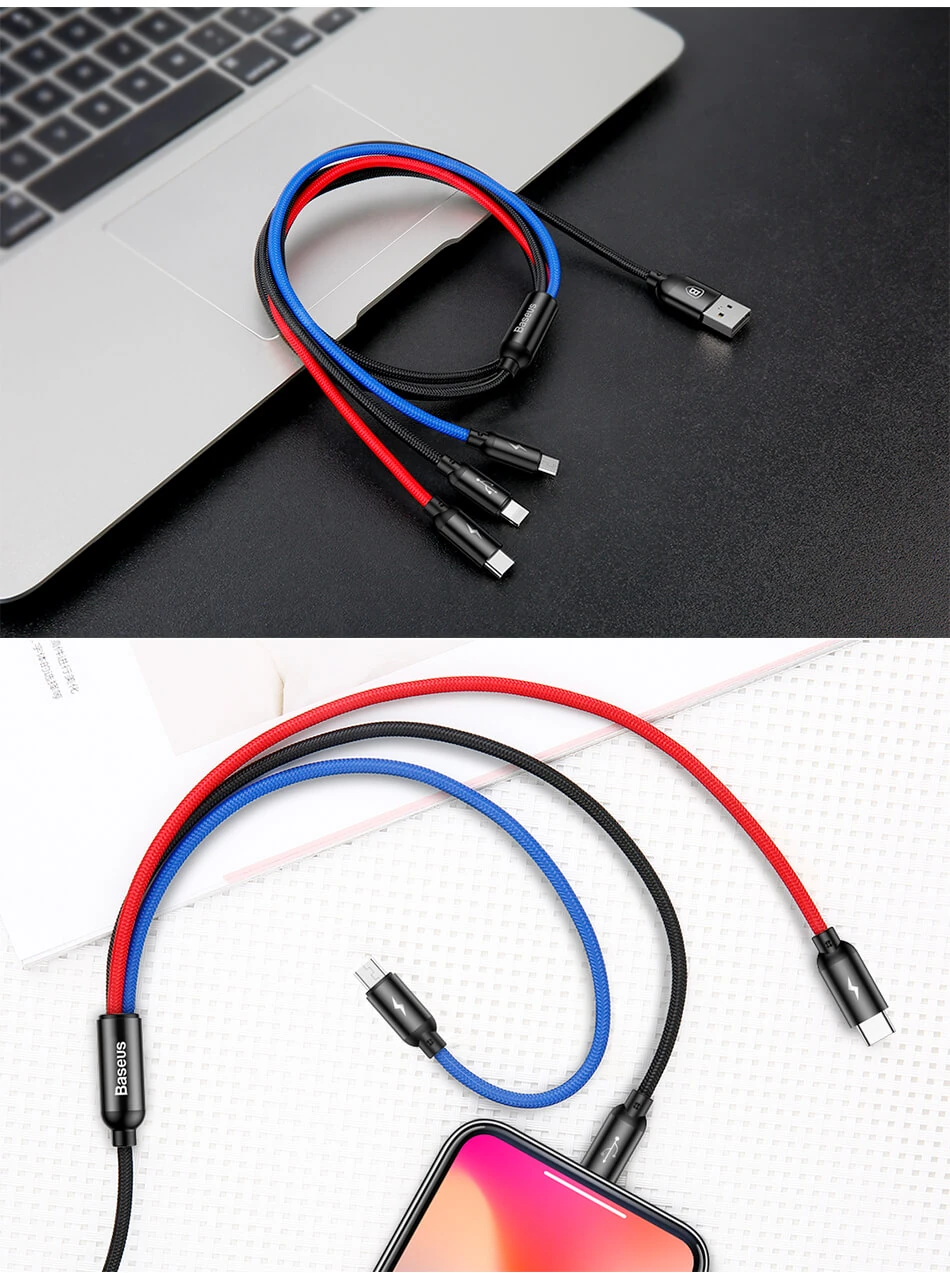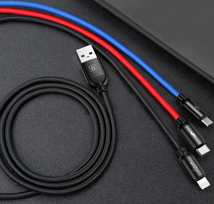 Baseus üç uçlu lightning, Type C ve Micro usb kablo, dış yüzeyini saran çelik örgü ile neredeyse kopması imkânsız hale gelen yüksek kaliteli ve son derece sağlam bir kablodur. Çelik Örgü Şarj Kablosu, aynı anda iPad, iPod veya iPhone gibi Lightning giriş ihtiyacı olan cihazlarla birlikte Sony, Samsung, HTC, Asus Xiaomi Huawei vb. markaların ürünlerinde tercih ettiği Micro USB ve yeni bir teknoloji olarak karşımıza çıkan Type-C giriş kullanan her hangi bir cihazı şarj edebilirsiniz.